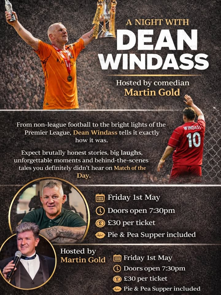 TICKETS NOW ON SALE 🚨 We’re excited to announce A Night with Dean Windass – an evening packed with stories, laughs, and proper football banter ⚽🍻 From non-league to the Premier League, Dean will be sharing it all – the highs, the madness, and the moments you won’t have heard anywhere else. 🎤 Hosted by comedian Martin Gold 📅 Friday 1st May ⏰ Doors open 7:30pm 💷 £30 per ticket 🥧 Pie & Pea Supper included Expect big laughs, great atmosphere, and a night to remember! 🎟 Tickets available now from the bar or online via Skiddle – https://www.skiddle.com/e/42086250 #DeanWindass #FootballNight #LiveEvent #TicketsOnSale #NightOut